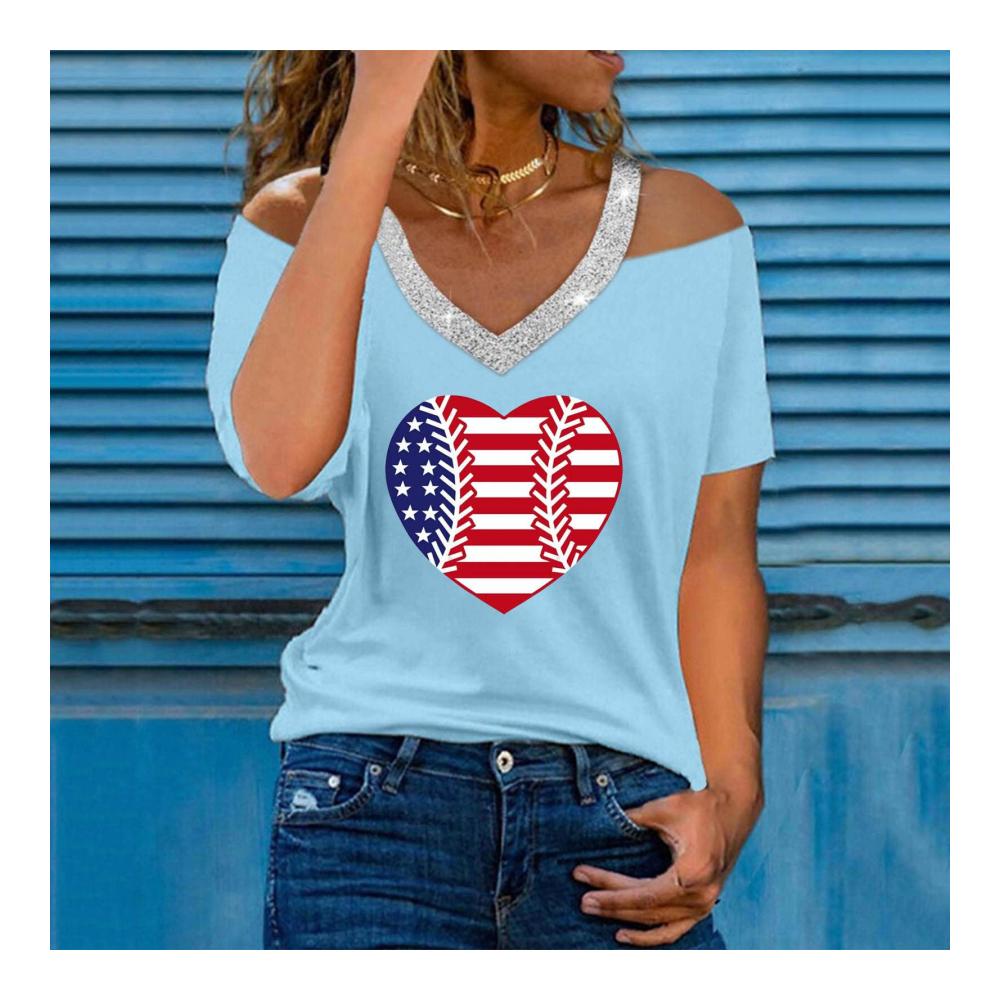 Damen T-Shirt mit V-Ausschnitt, schulterfrei, kurzärmelig, T-Shirt Jahreszeit: Sommer. Für Damen. Anlass: Alltag, Freizeit. Material: Polyester. Muster: Druck. Stil: Leger. Ärmellänge: kurz. Kragen: V-Ausschnitt. Passform: Fällt der Größe entsprechend aus. Dicke: Standard. Lieferumfang: 1 x Damenbluse.