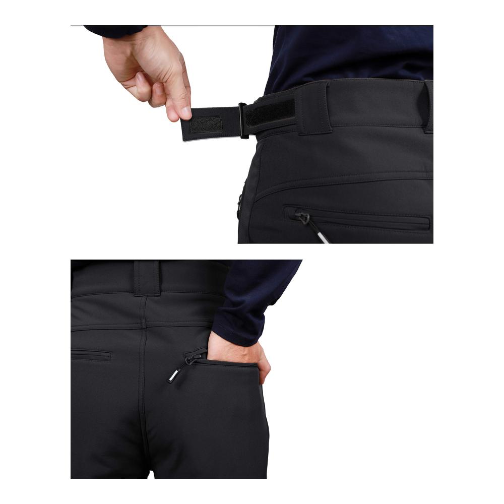 Verstellbare Taille mit KlettverschlussVerstellbare Taille mit Klettverschluss, kommt mit teilweise seitlich verstellbarer Taille, bequemer seitlicher elastischer Bund ermöglicht Hose maximale Passform und Komfort, Bewegungsfreiheit und freie Atmung. | Fleecegefütterte TaschenDie seitlichen Reißverschlusstaschen sind mit Fleece gefüttert, um Ihre Hände warm zu halten. Winterliche ultrawarme Outdoor-Wanderhose, weiches Fleecefutter für Wärme und geeignet für Winter-Outdoor-Aktivitäten. | Reflektierende ReißverschlüsseOutdoorhose für Herren.. Alle Reißverschlüsse sind reflektierend, auffälliger und nachts sicherer. Intime Details ermöglichen es Ihnen, Outdoor-Sportarten bequemer zu genießen. | Abnäher am KnieAbnäher am Knie sorgen für Flexibilität. Bewegungsfreiheit, Stretch-Spandex-Softshell-Hose mit vorgeformten Knien bietet große Flexibilität, volle Beweglichkeit und perfekte Passform. |