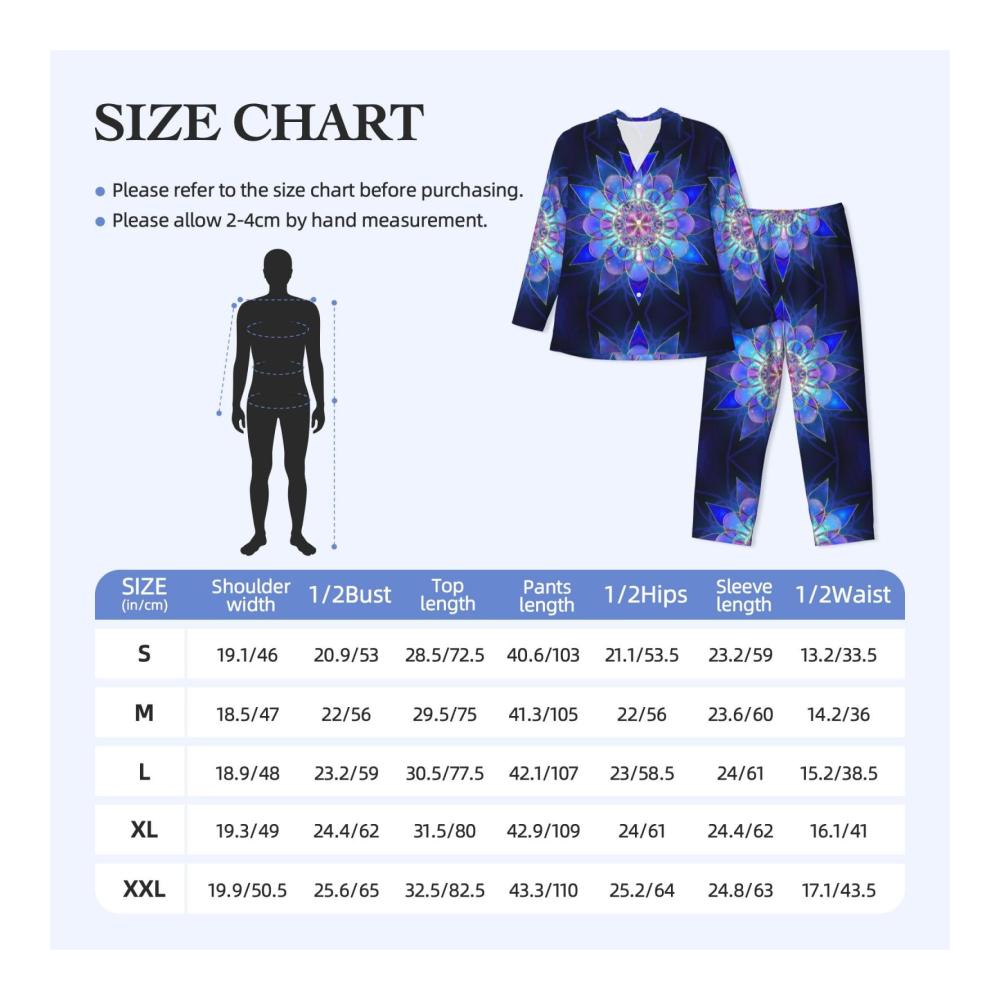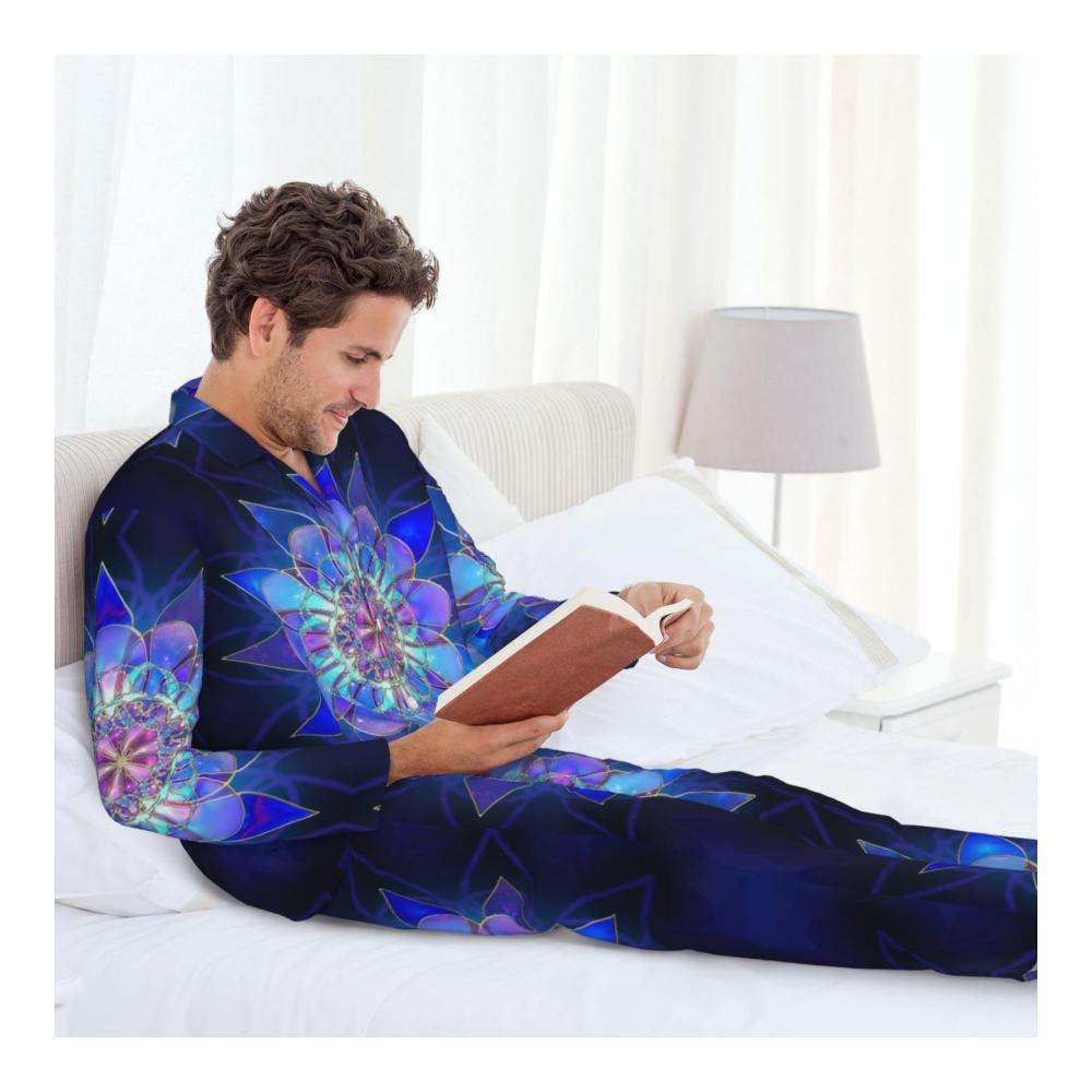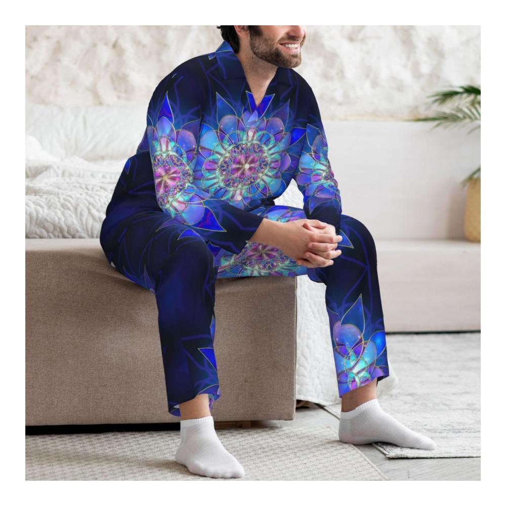 Entspannt schlummern: Langärmeliges Pyjama-Set mit Bohemian-Lotusblumen-Print für ultimativen Komfort und Stil. Hergestellt aus einer weichen und atmungsaktiven Mischung aus 95 % Polyesterfaser und 5 % Elastan. Dieser Schlafanzug verfügt über einen klassischen flachen Kragen und eine Knopfleiste vorne für eine raffinierte Note. Mit elastischem Bund und praktischen Seitentaschen. Perfekt für gemütliche Nächte und faule Wochenenden. Genießen Sie die ideale Verschmelzung von Komfort und Mode.