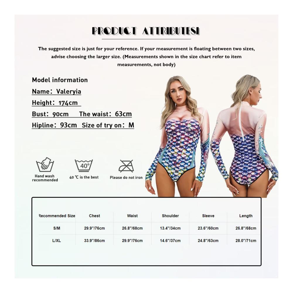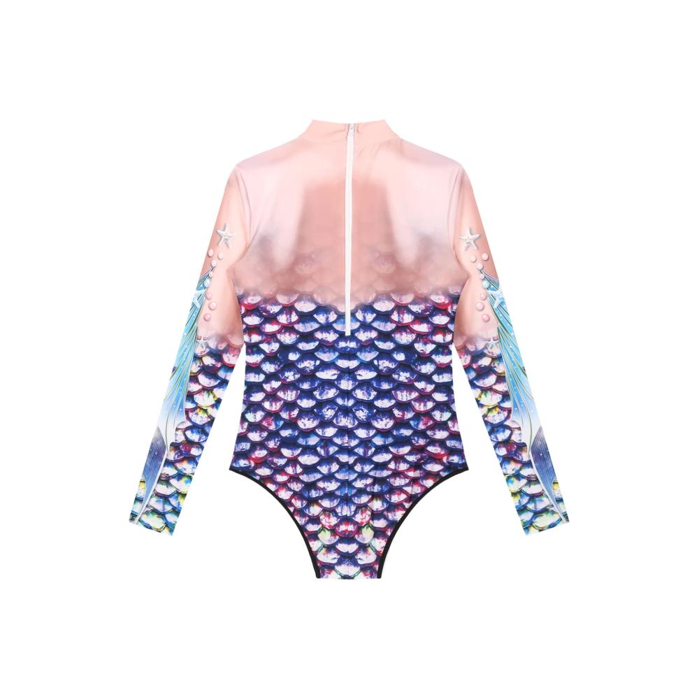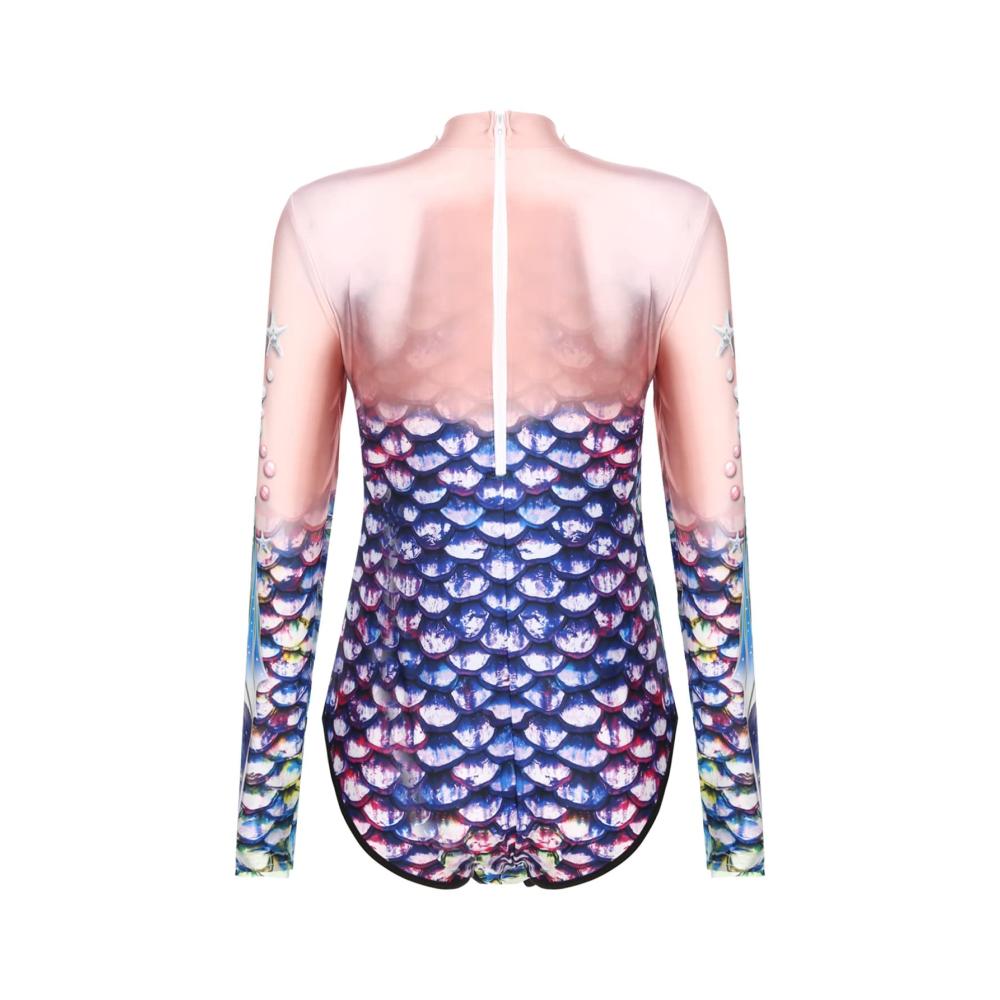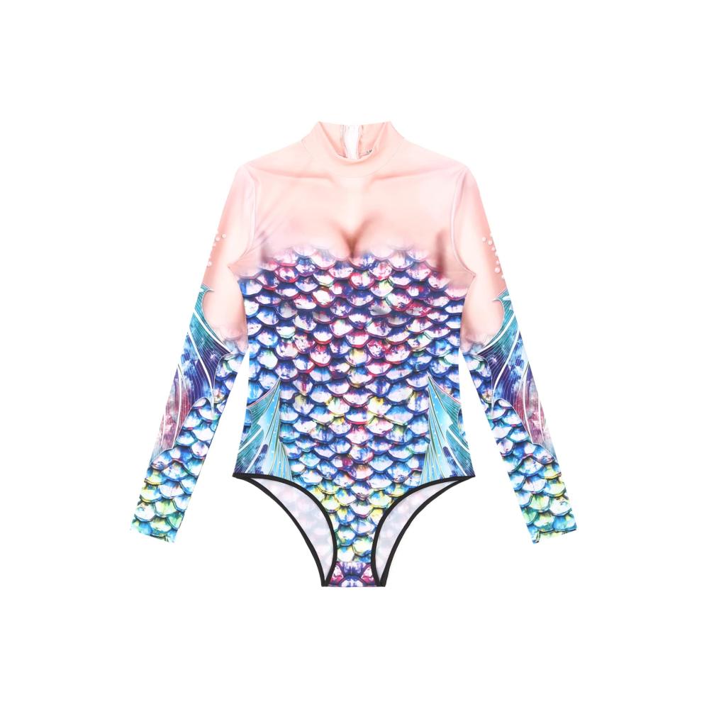 Verlockender Damen Badeanzug Meerjungfrau Kostüm Einteiler mit Fischschuppen-Muster. Langarm Jumpsuit für unwiderstehliche Bademode. Sexy Badekleidung für stilvolle Auftritte