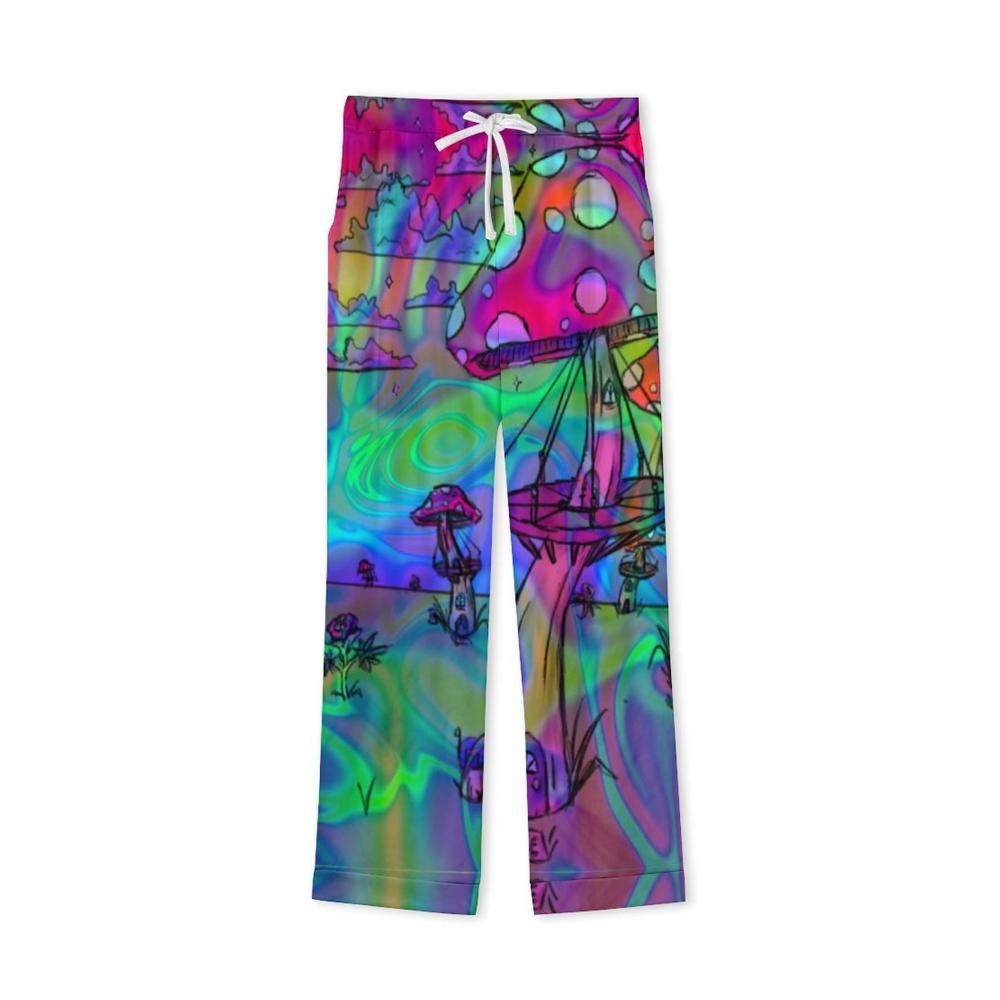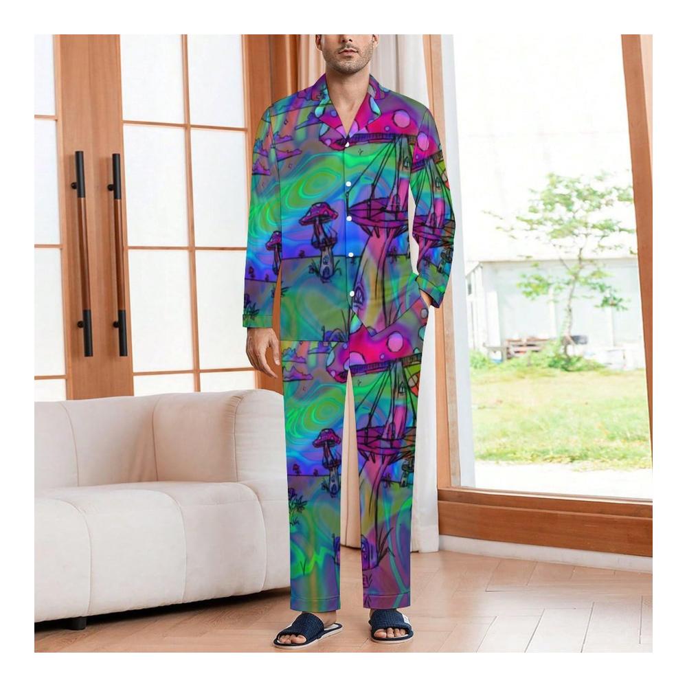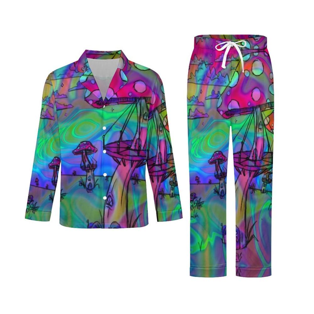 Gemütliche Herren Schlafanzüge Stilvoll Bequem und Praktisch! Psychedelische Trippy Mushroom Muster Taschen V-Ausschnitt. Schlafen Sie stilvoll und bequem