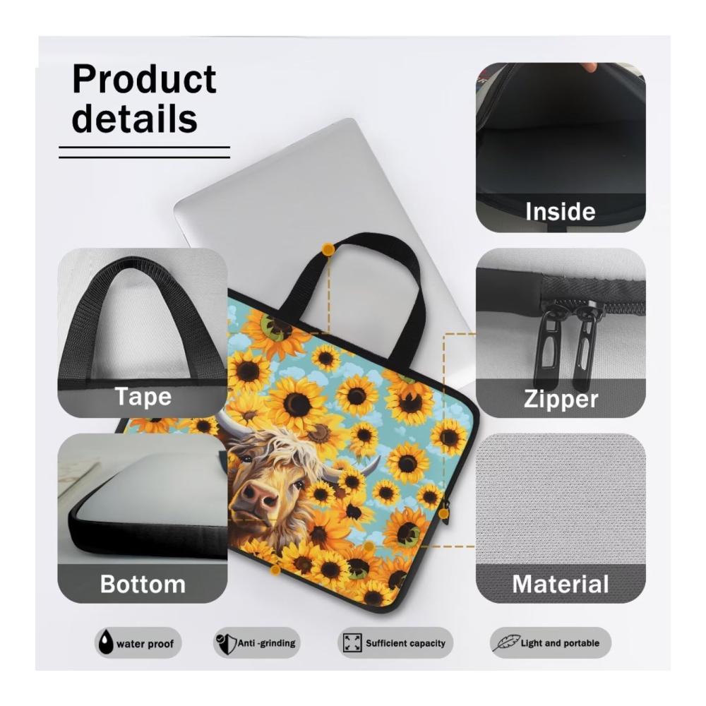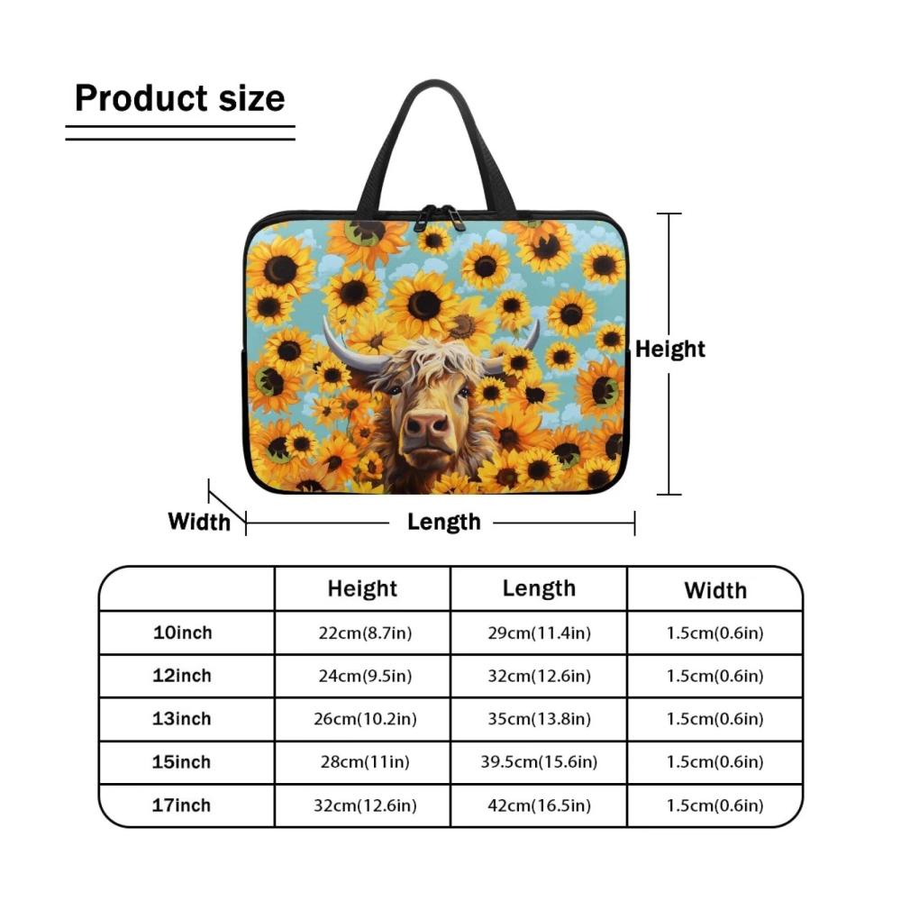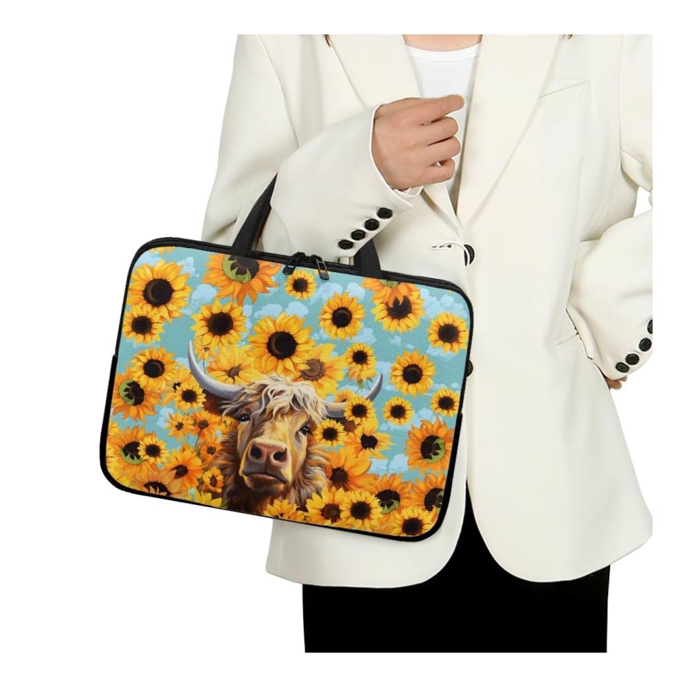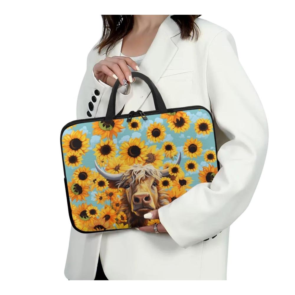 Stilvolle Laptop-Aktentaschen für Damen und Herren | 25-43 cm | Organizer und Schultergurt | Gelbe Sonnenblumen-Hochlandrinder | 17 Zoll