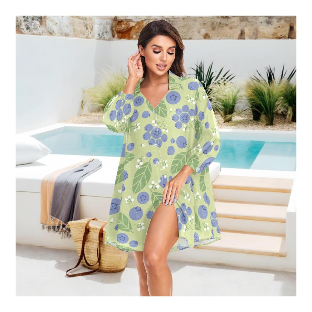 Lockerer 3/4-Langarm-Badeanzug für Damen, Knopfleiste, Schlaf-Shirt, Kleid, Strandvertuschung.