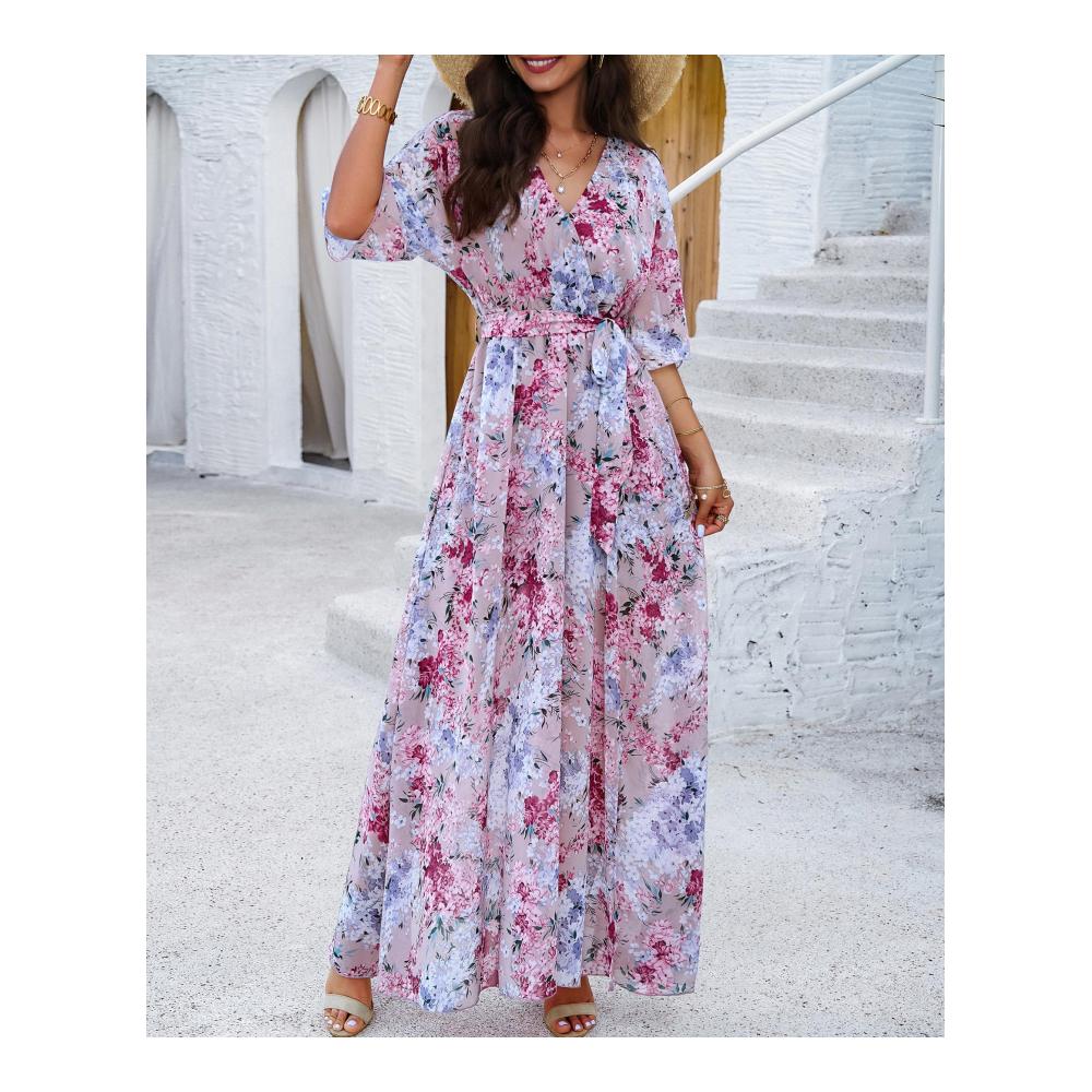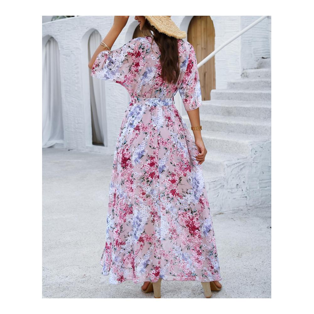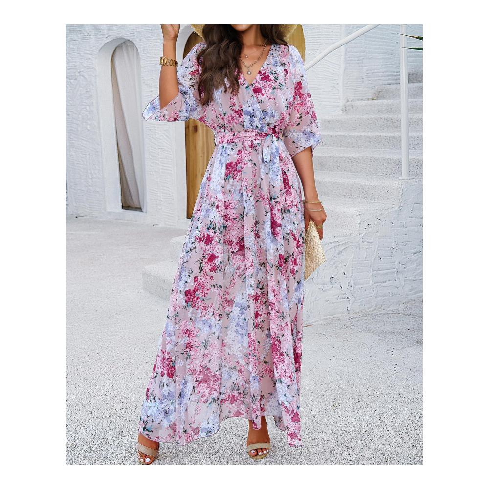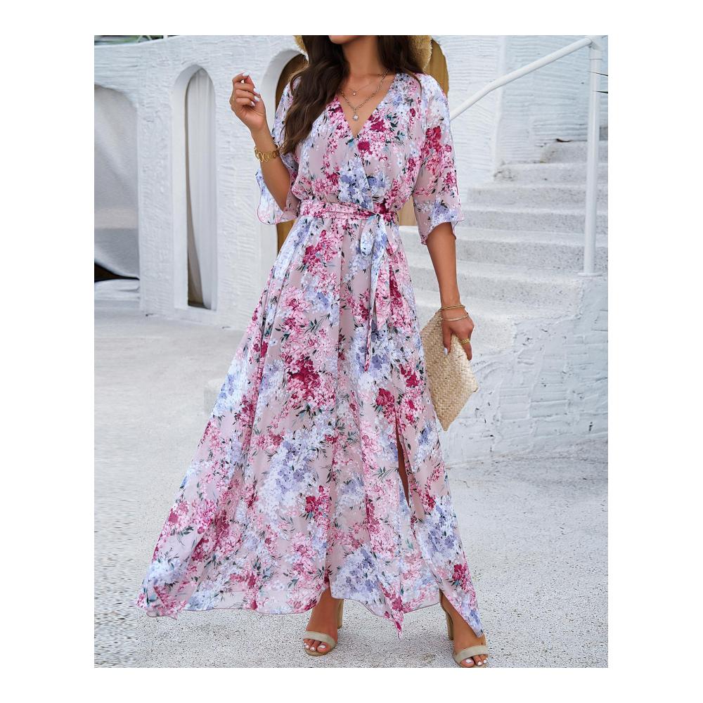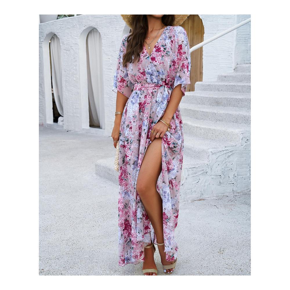 Produktmerkmale: Gewebe, Chiffon, Blumen bedruckt; Fledermausflügel, kurze Ärmel, Innenweste, ärmellos; V-Ausschnitt, überlappend; Gummibund mit Gürtel, Taille Tuck; A-Linie Saum, Schlitz vorne; Langes Kleid,Pullover, Kuchen Rock, langer Rock,Kleid